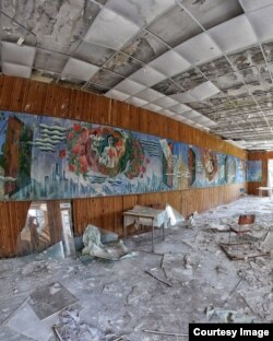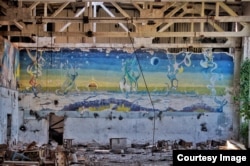 Это здание, предположительно конца 1980-х годов, в стиле советского модернизма: отделано ракушечником, мрамором снаружи, всякие красивые барельефы, мозаики внутри. При этом здание выглядит как очень сильно разворованное: нет даже батарей и труб. Попасть туда легко: нет ни охраны, ни забора.